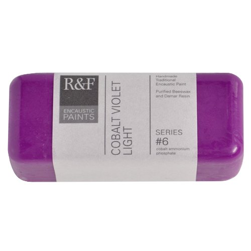 RF Encaustic 104ml, R&F encaustic paint, 104ml in cobalt violet light is a delicate, almost ephemeral, pinkish violet. It has a very weak tinting strength. R&F encaustic paint is composed of 100-percent pure pharmaceutical grade beeswax, singapore-grade damar resin and chemically pure pigments. Beeswax is impervious to moisture making encaustic paint extremely durable. There is no need to varnish or protect your painting with glass. It will not deteriorate, yellow or darken. Encaustic paint is kept molten on a heated palette. It is then applied to an absorbent surface and is fused to create a variety of effects. Encaustic goes from a liquid to solid state and back again in seconds giving you the opportunity to add layers without disrupting your composition. Once the surface has cooled, the paint has reached a permanent finish, but with heat, you can revise and rework your painting minutes or years later! This highly versatile medium can be polished to a high gloss, carved, scraped, layered, collaged, dipped, cast, modeled, sculpted, textured and combined with oil.