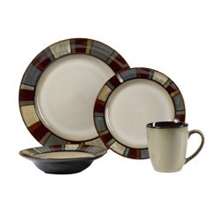 Pfaltzgraff Everyday Nile, Strikingly contemporary Nile uses the interplay of thin and wide tiles to create a unique and colorful rim. The bold palette is a stunning addition to any table setting. Made of high quality stoneware and designed for everyday use. 64 piece set, service for sixteen, includes (16) each: 11 inch dinner plate, 8 inch salad plate, 8-1/2 inch bowl and 12 ounce mug. Dishwasher and microwave safe.