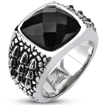 Spikes Jewelry , Mens stainless steel wide cast ring with gator scale facade and accented by a large onyx cubic zirconia. Measures 16mm in width. Available in sizes 9 to 13.. Specifications: 316L Surgical Grade Stainless Steel, Black Onyx Cubic Zirconia. Spikes Mens Stainless Steel Onyx Cubic Zirconia Gator Skin Wide Cast Ring. Spikes stainless steel jewelry is a trendsetting 316L jewelry collection created for today's stylish men and women who want leading-edge jewelry designs.